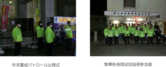 福山東遊技業防犯協力会(富山長鎬支部長)、福山北遊技業防犯協力会(新井慶助支部長)は、 「だれもが安全・安心を実感できる福山市の実現」を目指した活動として、福山市役所南側広場において実施された「年末警戒パトロール出発式」の後、2コースに分かれてパトロールを実施、その後、暴力団排除チラシ等を繁華街飲食店等に配布し、協力依頼を行いました。