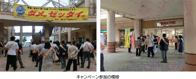広島県遊技業防犯協力会連合会福山東遊技業防犯協力会(富山長鎬 支部長)、福山北遊技業防犯協力会(新井慶助 支部長)は、福山市暴力監視追放協議会の会員として、広島県薬物乱用防止指導員福山地区協議会、ヤングボランティア(中学生)等とともに、薬物乱用防止街頭啓発キャンペーンに参加し、啓発チラシ配布及び国連支援募金活動を行いました。