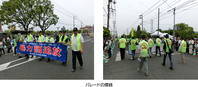広島県遊技業防犯協力会連合会福山東遊技業防犯協力会(富山長鎬 支部長)、福山北遊技業防犯協力会(新井慶助 支部長)は、福山市暴力監視追放協議会の会員として、「第57回福山ばら祭2024」開催時に行われた「ローズパレード」に参加しました。色とりどりの衣装に身を包んだ33団体約1,700人がダンスやよさこい踊りなどを披露しながら練り歩く中、「暴力団追放」の横断幕を掲げて実施し、暴力団排除意識の高揚を図りました。