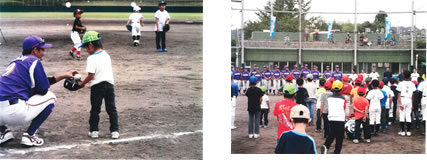 「伯和ビクトリーズ」は、東広島市内の少年野球チームに所属する小学生62名を対象に野球教室を開きました。参加した子ども達は、伯和ビクトリーズの選手が仕事をしながら、夜遅くまで激しい練習をし、休日なしで試合遠征や社会福祉活動に頑張っているという監督の話に真剣に耳を傾けていました。子ども達は、コーチや選手25名から野球の基本的な姿勢や動作について直接、指導を受け、汗を流しました。