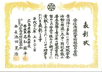 県警本部長及び県防犯連合会会長連名の感謝状を受領 平成29年5月23日(火) 広島市中区 「メルパルクひろしま」 安佐南支部(平本直樹支部長)は、長年にわたる地域安全活動、青少年健全育成活動に貢献した功労が認められ、県警察本部長及び県防犯連合会長連名の感謝状を頂きました。