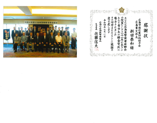 広島東支部(新田泰和支部長)は、所轄警察署である広島東警察署の剣道場を拠点として活動している少年剣道クラブ「広島東警察署若鯉会」に対し、21年間にわたって財政支援しており、「令和4年度広島東警察署若鯉会総会」において、佐藤信夫広島東警察署長から感謝状を授与されました。