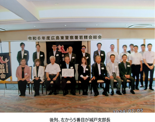 広島市遊技業防犯協力会広島東支部(城戸賢二支部長)は、広島東警察署の剣道場を拠点として活動している少年剣道クラブ「広島東警察署若鯉会」に対し、23年間にわたる長期財政支援を継続中であり、城戸支部長が同会の総会に出席しました。