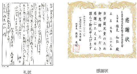 広島市遊技業防犯協力会広島南支部(塩見和弘支部長)は、同学園に対して平成5年頃から10年間、クリスマスケーキをプレゼントし、平成16年からは事前に施設側の希望を聞き、毎年リュックサック、ビデオデッキ、パジャマ、ソックス、DVD、バレーボール、布団・毛布等、10万円前後の品物を寄贈しています。本年は、水筒29個を寄贈しており、同施設の高井園長から礼状と感謝状をいただきました。