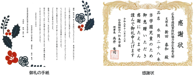 広島市遊技業防犯協力会広島南支部(新田泰和 支部長)は、社会福祉活動の一環として、平成5年頃から30年以上、毎年、同学園に対しクリスマス慰問と称して、リュックサック、ビデオデッキ、ステンレスボトル、パジャマソックス、傘、DVD、バレーボール、布団・毛布等、10万円程度の品物を寄贈しています。同学園から「楽しいクリスマスを開催することができ、子どもたちも大変喜んでいます。」との謝意を受けています。