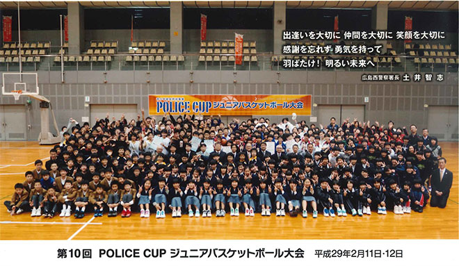 広島西支部の岡村春植支部長が大会実行委員長を務める「第10回ポリスカップジュニアバスケットボール大会」は、大勢の保護者及び教職員の声援の中、広島市内の中学校男子・女子の各12校が熱戦を繰り広げました。同大会は、広島市遊協の財政支援を受け、広島西支部役員が大会実行委員会の中心となって開催準備、大会運営にあたり、3月9日には広島西警察署長から長年にわたり青少年の健全育成に功労があったとして実行委員会に対し、感謝状が贈られました。