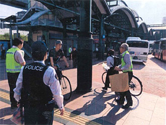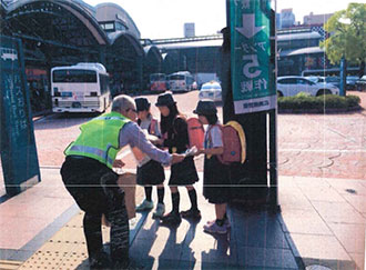 広島西支部(岡村春植支部長)は、社会貢献活動の一環として、支部長以下9名が防犯チョッ キを着装し、所轄警察署員等と共にJR横川駅駐輪場利用者に対し、ワイヤー錠と啓発チラシを配布し被害の防止を訴えました。
