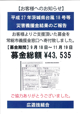 広支部(山本基甫支部長)傘下の7店舗は、9月に発生した台風18号による大雨等水害に対して、9月18日から11月19日の2か月間、各店舗内に義援金箱を設置して支援を呼び掛け、11月25日、お客様からお預かりした募金4万3,515円を被災者の方々に常総市を通じて送りました