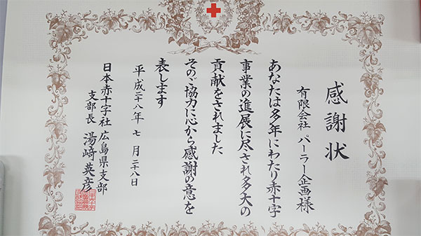 三原支部傘下のランドマーク三原(㈲パーラー企画)は、日本赤十字社主催の広島県献血推進功労者等表彰伝達式において、日本赤十字社広島県支部長から感謝状が贈呈されました。ランドマーク三原では、平成23年から年2回、同店駐車場を利用し、従業員やお客様を対象とした献血活動に協力しています。