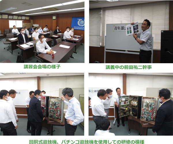 青年部会(部会長 西原孝徳)は、西原部会長からの「部会員各自が不正防止に対する強い意識と高い知識を持って検査にあたるべき」との指示後、青年部会前田祐二幹事を講師として、設置した回胴式遊技機、ぱちんこ遊技機を使用し、検査箇所、検査要領に関する研修を行いました。
