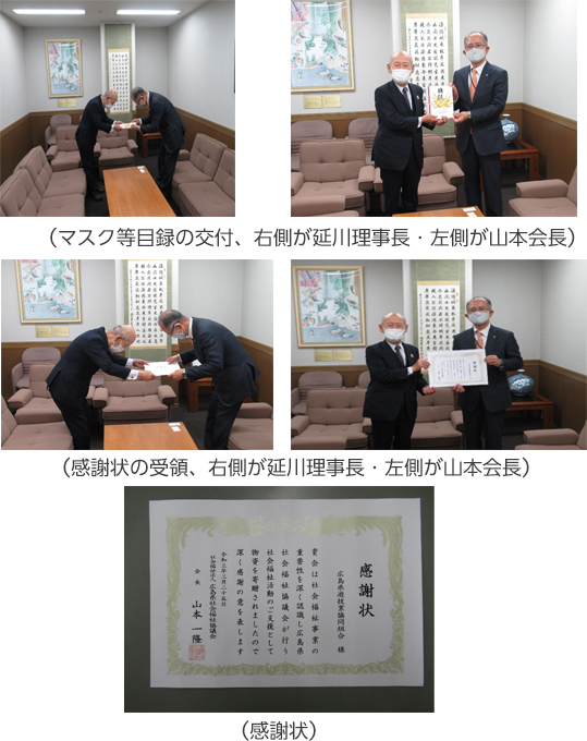 広島県遊技業協同組合(延川章喜理事長)は、未だに収束の見えない新型コロナウイルス感染症対策のため、広島県社会福祉協議会にマスク2万枚、ハンドジェル(消毒液)300本を寄贈しました。