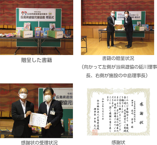 広島県遊技業協同組合(延川章喜理事長)は、本年6月25日(金)から3日 間開催した「広島パチンコ・パチスロファン感謝デー」に併せ、社会貢献活動の 一環として、幹事会社の「(株)そごう・西武」と「BOOK OFF」がコラボし た児童用図書を広島県内全域におけるすべての児童養護施設(12施設)に贈呈 することとし、それに先立ち、上記施設において贈呈式を行いました。 本取組みは今回で3回目となり、例年各施設から感謝状を受領しています。