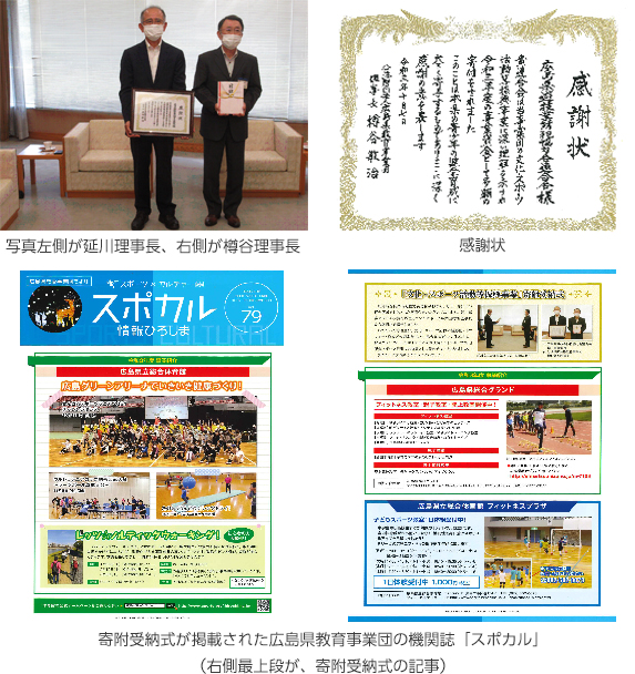 広島県遊技業協同組合(延川章喜理事長)は、昭和57年から、公益財団法人広島県教育事業団主催の「文化・スポーツ活動振興事業」に対して、250万円から200万円の財政支援を行ない、同事業の目的である青少年健全育成に寄与しています。令和3年度は、10月7日、広島県立体育館において、寄附受納式を行い、延川理事長が、樽谷理事長に対して、寄附目録(200万円)を授与、樽谷理事長から感謝状を受領しました。