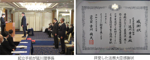 広島県遊技業協同組合(延川章喜理事長)は、長年にわたって更生保護法人広島県更生保護協会の事業運営を財政支援することで更生保護事業の推進に貢献したとして、法務大臣感謝状を拝受しました。11月22日、「ホテルセンチュリー広島」において、延川理事長が、広島保護観察所山田浩司所長から、感謝状を受領しました。(今回は、新型コロナウイルス感染拡大防止の観点から、代表者が受領。)