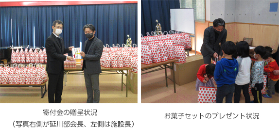 青年部会(延川然太部会長)は、例年プロマジシャンによるマジックショーや園児とハンドベルを合奏、またクリスマスケーキ会食などを行い楽しいふれあいの時間を持っていましたが、新型コロナウイルス感染拡大防止の観点から園児とのふれあいを中止し、園児にお菓子セットをプレゼントし、施設に対して環境整備費及び生活必需品の購入費用の一部として20万円を寄附しました。