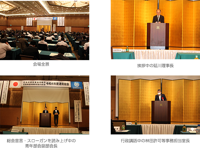 広島県遊技業防犯協力会連合会・広島県遊技業協同組合(延川章喜理事長)は、通常総会を開催し、理事長挨拶の後、広島県警察本部生活安全部長岩上譲治様、広島労働局労働基準部監督課小岸圭太課長様の祝辞をいただきました。その後、各議案審議を行い、青年部会、長谷川康垣副部会長、森谷聡希副部会長がそれぞれ総会宣言、スローガンを読み上げ、決議しました。