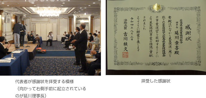「法務大臣感謝状」を拝受 ○令和4年8月2日(火) ○広島市南区的場町 「ホテルセンチュリ―21広島」 広島県遊技業協同組合(延川章喜理事長)は、長年にわたって「更生保護法人 広島県更生保護協会」の事業運営を援助することで、更生保護事業の推進に貢献したとして、法務大臣感謝状を拝受しました。