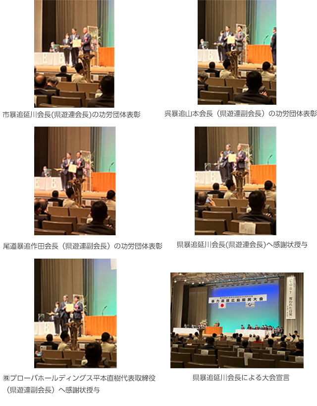暴力追放広島県民会議設立35周年記念 暴力追放広島県民大会に出席 ○令和4年11月30日(水) ○広島市中区中島町「広島国際会議場 フェニックスホール」 広島市中区中島町「広島国際会議場 フェニックスホール」同記念大会に広島県遊技業防犯協力会連合会役員(延川章喜会長・作田寧秀副会長・山本基甫副会長・平本直樹副会長)が出席し、暴追関係表彰等を受賞しました。