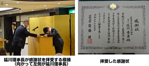 「法務大臣感謝状」を拝受 ○令和5年7月28日(金) ○広島市中区立町 「ひろしま国際ホテル」 広島県遊技業協同組合(延川章喜理事長)は、長年にわたって「更生保護法人 広島県更生保護協会」の事業運営を援助しており、法務大臣感謝状を拝受しました。
