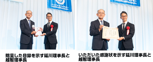 広島県遊技業協同組合(延川章喜理事長)は、組合創立60周年記念事業の一環として、「NPO法人広島子ども食堂支援センター(広島市中区)に、活動支援金として400万円を寄贈しました。「リーガロイヤルホテル広島」において開催した記念大会式典において、贈呈式を開催しました。延川理事長が、支援センターの越智理事長に目録を手渡し、越智理事長から感謝状をいただきました。