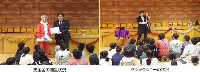 青年部会が児童養護施設にクリスマス慰問 ○ 令和5年12月14日(木) ○ 広島市東区尾長東 「社会福祉法人 広島修道院」 青年部会(長谷川康垣部会長)は、令和5年10月5日(木)、青年部会が主催した「児童福祉活動支援チャリティーゴルフコンペ」(東広島カントリークラブ)でのチャリティー金を活用し、児童養護施設へのクリスマス慰問を行いました。 施設に対して支援金や図書カード、ヤクルトを贈呈するとともに、児童に対して、マジックショーを見て楽しんでもらいました。