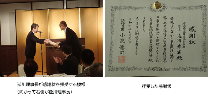 「法務大臣感謝状」を拝受 ○令和6年7月18日(木) ○広島市東区光町「広島ガーデンパレス」 広島県遊技業協同組合(延川章喜理事長)は、長年にわたって「更生保護法人 広島県更生保護協会」の事業運営を援助しており、法務大臣から感謝状を拝受しました。